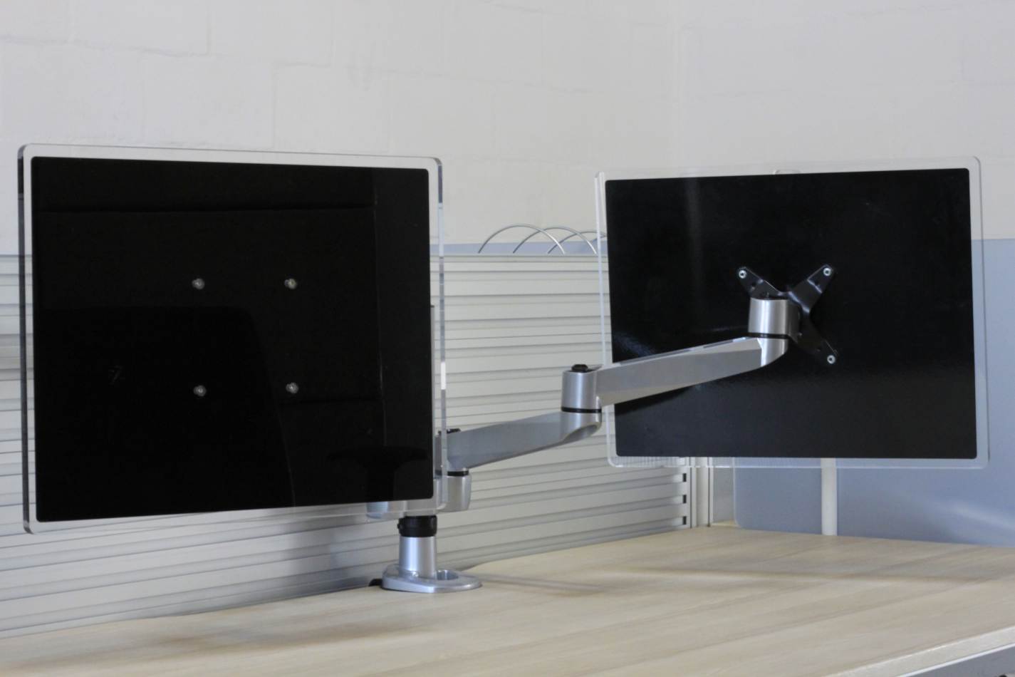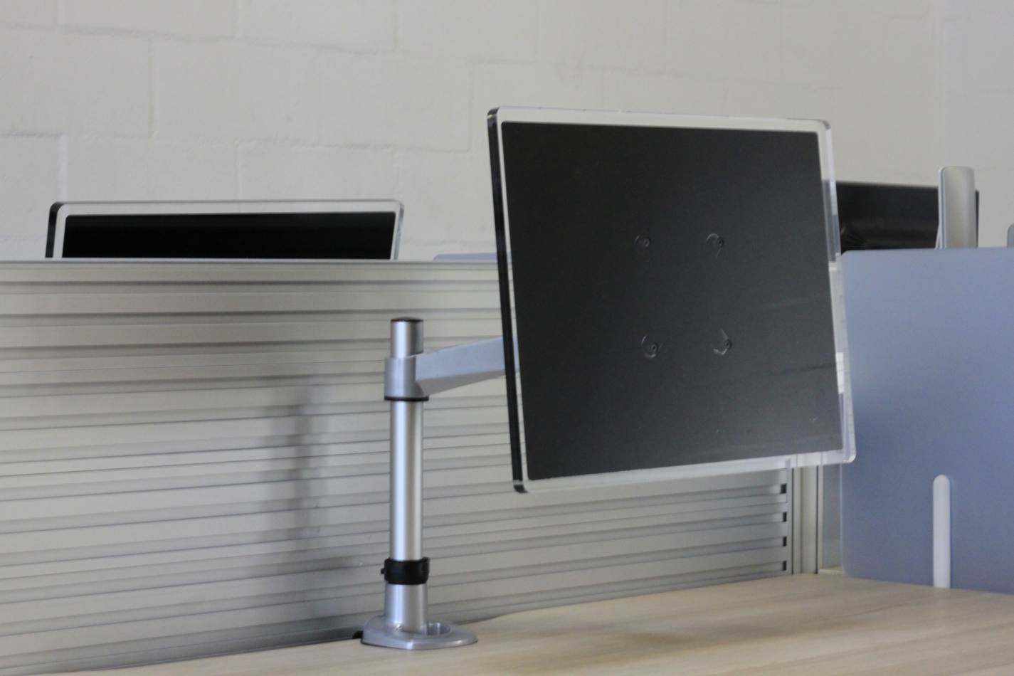 Our monitor arms attach to desks, walls, workspace dividing screens, slat-rail, etc.